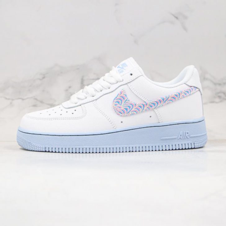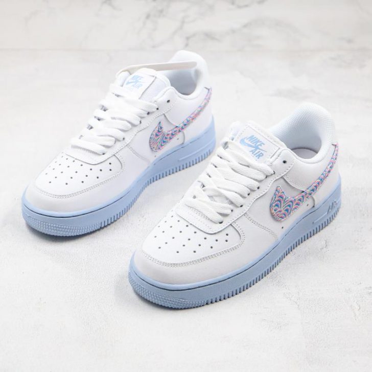 The women’s Nike Air Force 1 Low ‘Hydrogen Blue’ updates the classic silhouette with a swirling multicolor design on the signature Swoosh. The psychedelic pattern stands out against the sneaker’s white leather upper, appointed with standard details that include a perforated toe box and Nike-branded heel tab. A uniform pale blue finish is applied to the foam midsole and pivot-point rubber outsole.