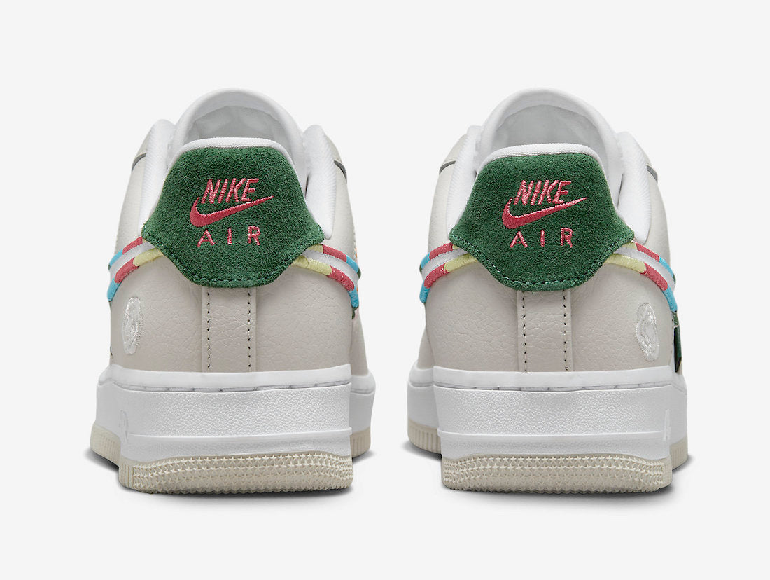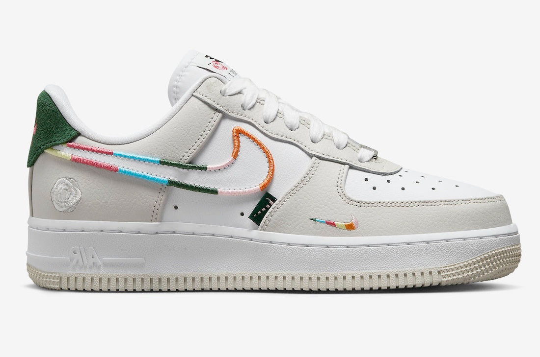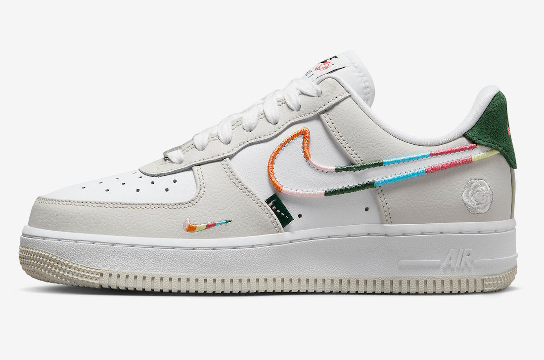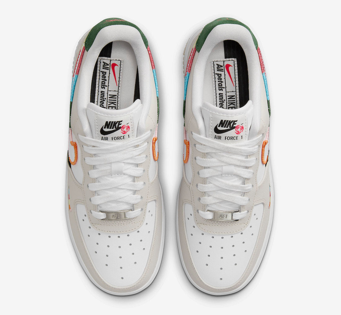 Dressed in a White, Fir, Adobe, and Bright Mandarin color scheme. This offering of the NIKE AIR FORCE LOW comes constructed in a full leather build with mesh tongues and inner lining. It features a White base with Light Bone overlays highlighted with a colorful 3D embroidered Swooshes on the sides to matching its mini Swoosh on the lateral forefoot. Other details includes a tonal embroidered flower on the lateral ankle with a small rose motif on the tongues. A Green suede heel overlay, lateral labels, with “All Petals United” stamped onto the insoles atop a two-tone AF1 rubber sole completes the design.