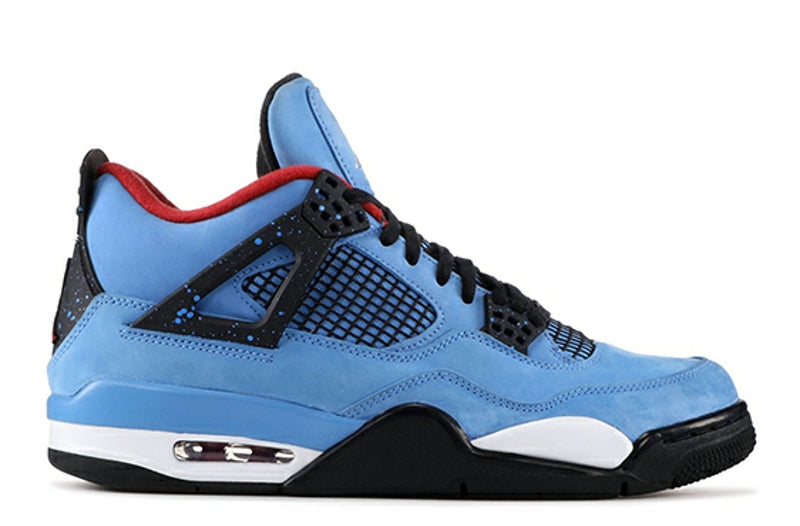 Music artist Travis Scott hails from Houston, where the Oilers used to take the field in red, white and blue uniforms. The Travis Scott x Air Jordan 4 Retro 'Cactus Jack' colorway pays tribute to the city’s bygone football team with a Durabuck leather upper dressed in University Blue and a Varsity Red insole. The black lace cage and a heel panel feature a light blue speckle pattern. Cactus Jack branding appears on the left heel in Varsity Red, with a matching Jumpman logo on the right.