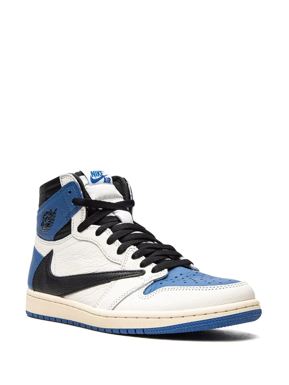 The Air Jordan 1 High OG SP Fragment Design x Travis Scott fragment draws inspiration from a Jordan 1 Royal press sample from 1985 with its white and blue tumbled leather upper. Similar to previous Travis Scott Jordan 1s, signature reverse Swooshes and hidden stash pockets in the collar add on to the classic design. From there, both Travis Scott's Cactus Jack and Fragment logos are debossed in black on the heel wrap.